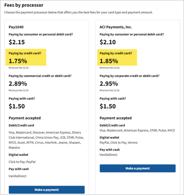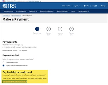 The IRS offers multiple means of payment, including credit cards. To make a payment via credit card, in the Make a Payment screen of the IRS website, select 'Pay by debit or credit card'. The IRS uses two payment processors, Pay 1040 and ACI Payments, each of which charge a fee for credit card use, 1.75% and 1.85% respectively. This may turn some of us off to the idea of paying with cards, but let’s dig into it a little more deeply.