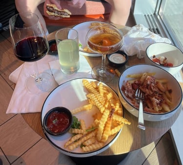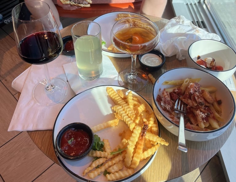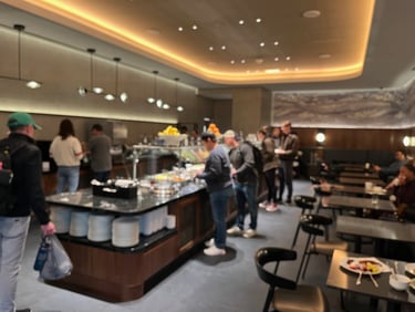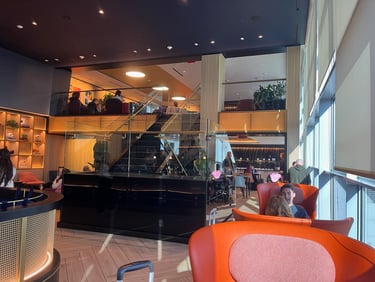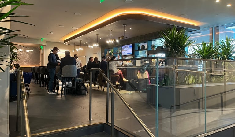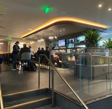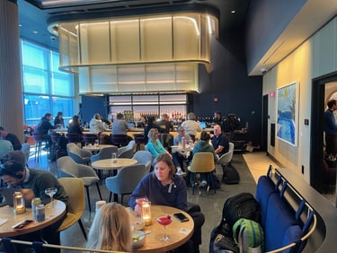 The lounge was relatively small, but ordering was easy using a QR code on the table to order from an online menu. Service was excellent. The food was terrific as well…my son and I ordered burgers and were able to get them made to order, exactly as we liked them. Their offer included a nice craft cocktail list, multiple beer and wine options, and soda in a self-serve fridge. Serf-serve small food plates were out as well, meaning there were plenty of options.