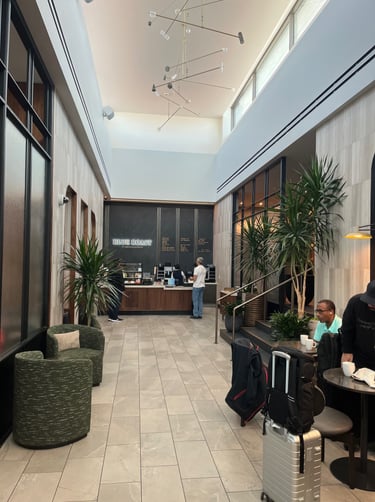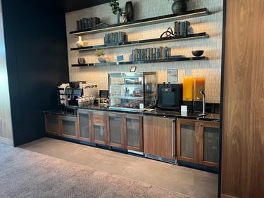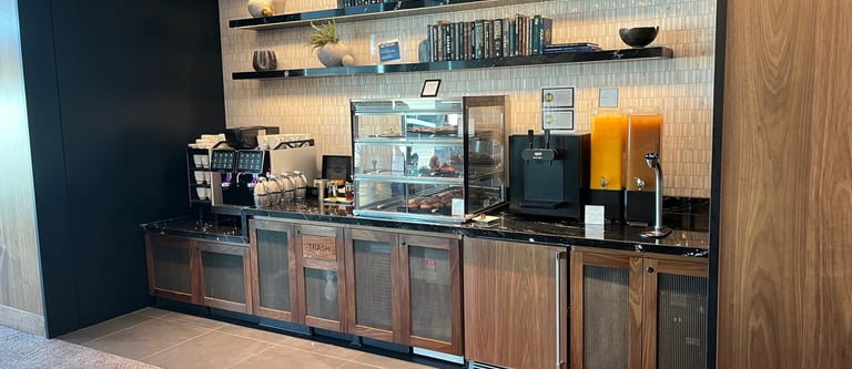 This lounge is also part of the Priority Pass collection, so many are aware of it and even more have access. I had low expectations of getting in because we went at peak time. Our flight was at 5:55pm, and we arrived at 4:15pm. At check-in there was a waitlist 20 names deep. We put our name on the waitlist and planned to go to a United lounge in Terminal C. After a quick stop for snacks and halfway to Terminal C, our name rose to the top of the waitlist. We turned around, headed back, and were led to a couple of comfortable high-backed seats. Because Chase still allows cardmembers 2 guests free of charge (and because it is a Priority Pass lounge), we were not charged upon entry.