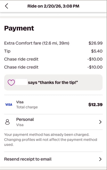 However, I recently picked up a Chase Sapphire Reserve for Business card because I know I’ll have a large tax bill upcoming, which also offers a $10 monthly credit. When assessing rideshares, I saw that the two credits actually stack for use on the same ride. With the stack, Lyft becomes the lowest priced alternative once per month. My ride fare to the airport, normally $27 plus tip, came to a total of $12.40 with tip included. The trip was off to a great start!